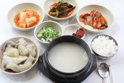 コムタン(牛スープ、곰탕)などともよく似た料理ですが、写真左下にある足のゼラチン質な部分を具として食べるという部分に特徴があります。普通ならコムタン専門店の付帯料理としてメニューに載るものですが、温陽温泉には珍しいことにウジョクタンの専門店というのがあるんですね。