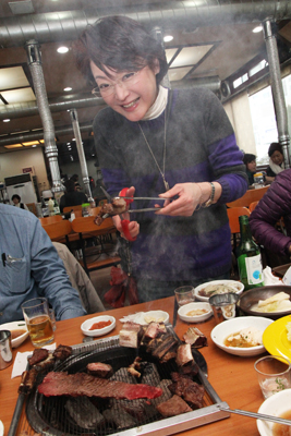 せっかくなので黒田福美さんの写真からもう1度。前回はスンドゥブチゲ(柔らかい豆腐の鍋、순두부찌개)を取り分けているところでしたが、こちらは焼肉をハサミでカットしているところです。福美さんノリノリで肉を焼き、カットし、取り分けていました。