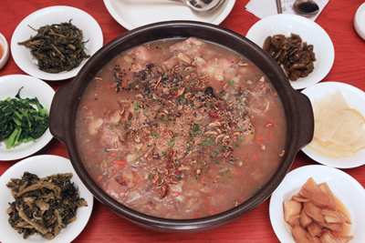 昼食は南漢山城名物のタットガニ(鶏粥鍋、닭도가니)をチョイス。山菜料理や豆腐料理などでも有名な地域ですが、山間部だけに鶏料理も自慢のひとつです。