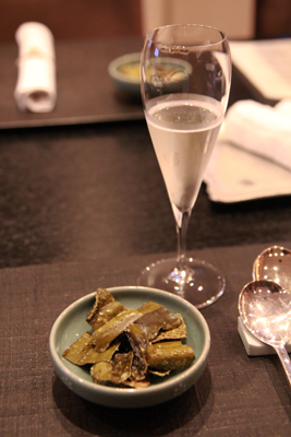 乾杯用のスパークリングワインにタシマティガク(揚げ昆布、다시마튀각)。