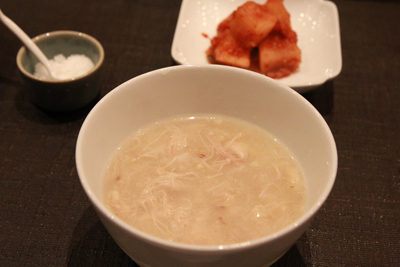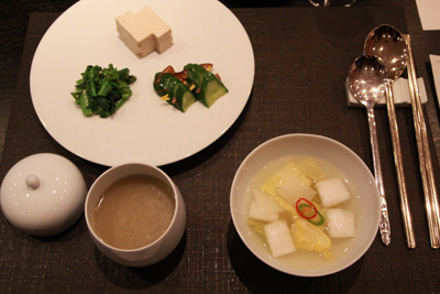 続いて、前菜として並んだのは、左下にコグマジュク(サツマイモ粥、고구마죽)、右下にムルギムチ(水キムチ、물김치)、左上は季節の前菜盛り合わせとしてオイソン(宮中式キュウリの蒸し物、오이선)、トゥブソン(宮中式豆腐の蒸し物、두부선)、ユチェナムル(菜の花のナムル、유채나물)の3種です。