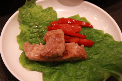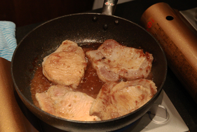 厚切りの豚ロースに塩、コショウ、おろしニンニクと、リニューアル発売の「塩ジャン焼肉のたれ」をどっさり。両面にすり込んでフライパンで表面を焼き、フタをして弱火でじっくり、というのが大きなポイントでしたね。