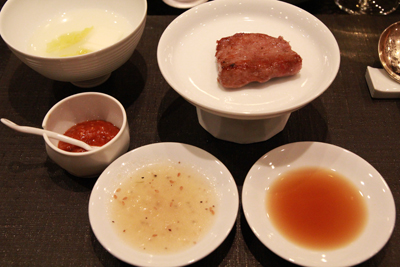 コースメニューに必ず焼肉が入るのは「モランボン神宮前」ならでは。この日は分厚い牛タンを社長のおすすめに従って、まずはそのまま、次に「塩ジャン焼肉のたれ」につけて、その次は自由にと三段階で楽しんだ後……。
