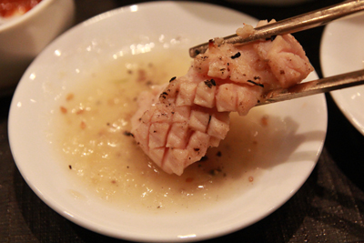 丁寧に切れ目を入れた柔らかなミノと、脂の乗ったカイノミを賞味、とこのあたりは怒涛の勢いでしたね。カリフォルニア産の赤ワインとともにたいへん美味しくいただきました。