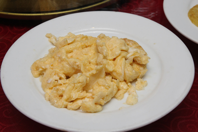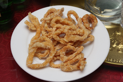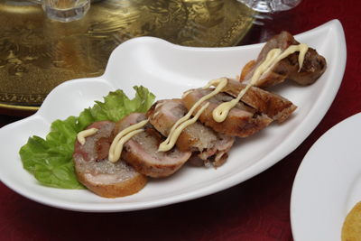 これは比較的トラディショナルな料理で、骨を除いた鶏モモ肉に、もち米、銀杏、ナツメ、松の実、栗を詰めて蒸したもの。主材料の鶏肉と味付けの蜂蜜を加えて七香という説明でしたが、そこにマヨネーズソースがかかっているのも文化の混ざった部分でしょうね。