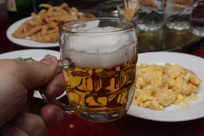 名物の大同江ビール(대동강맥주)で喉を潤す、というのは平壌における定番の楽しみ方です。なお、この店ではジョッキで出てきましたが、ほかの店ではみなビンで出てきました。