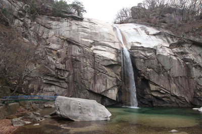 そうなると夏秋冬の朴淵瀑布も見てみたいものですが、とりあえず四季の移ろいとは無関係に、たいへん見事であったのが左手前にある橋のかかった岩です。