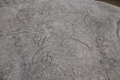 説明によれば、なんとファン・ジニの直筆であるとか。朴淵瀑布を訪れたファン・ジニがこのリョンバウィに上がり、長い髪先に墨を塗ってさらさらと書いたのが李白の詞。それを見ていた石工たちが、これは後世に残すべきだと彫ったのがこの文字だそうです。