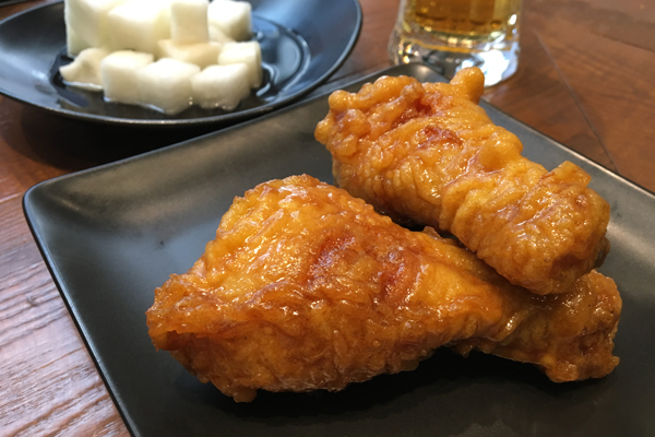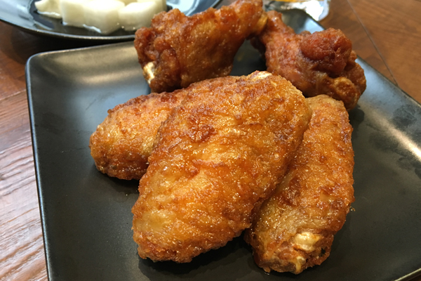 キョチョンの代名詞とも言える、ガーリック&醤油味のウイング(手羽元&手羽先)を注文しました。手前に手羽先が3ピース、後ろに手羽元が2ピース見えています。注文は5ピース、9ピース、18ピースと選べます。