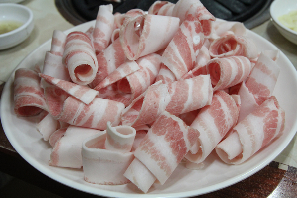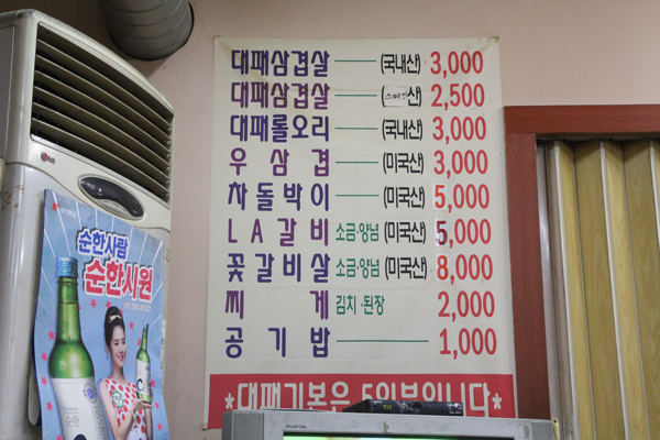 国産豚のテペサムギョプサル(薄切り豚バラ肉の焼肉、대패삼겹살)が1人前3000ウォン。