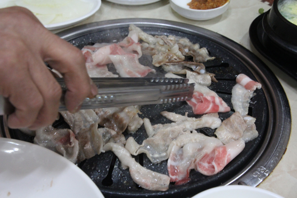 知人宅に泊めていただきつつ、もろもろの仕事を片付け、週明けにはソウルへ向かおうかというところです。そんな本日の夕食は近所のおすすめ店でサムギョプサル(豚バラ肉の焼肉、삼겹살)。店に入ってまず驚いたのは値段の安さでした。