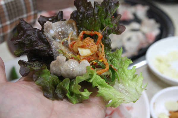 一応、安さにも理由があって、初回は必ず「5人前以上を注文」することになっています。となると、それだけでも最低1万5000ウォン。サンチュなどの葉野菜や副菜などを出しても、まあ売り上げのメドが立つということでしょうね。