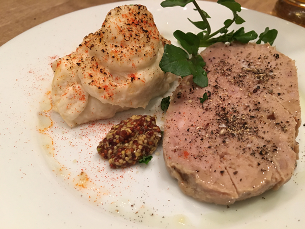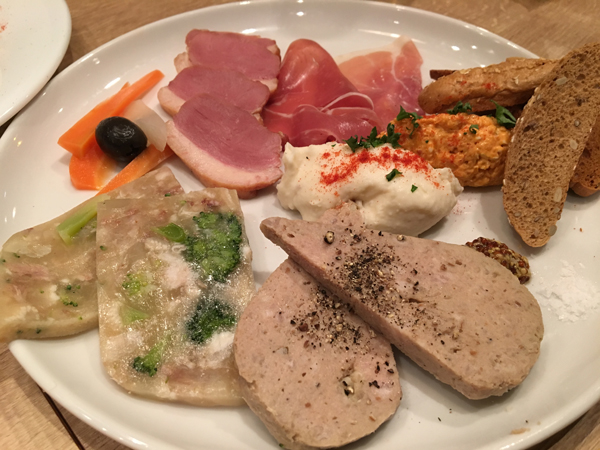 「韓国産テンジャン味噌を使った肉パテ、豚足と野菜を使ったテリーヌ、熟成キムチのクリームチーズ和え、鴨スモーク、生ハム、マッシュポテト」