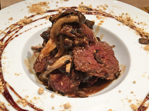 皿のまわりにはソースときな粉をあしらって、運ばれてきた後に目の前でトリュフを削って振りかけます。肉厚なハラミを噛み締めつつ、立ち上るトリュフときな粉の風味を楽しむという一品でした。