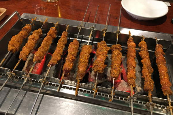 同じ店なのでもちろん看板メニューはヤンコチ(羊の串焼き、양꼬치)ですが、手焼きをしなければならない新大久保に対し、こちらは自動でくるくるひっくり返る専用の焼き器があるじゃないですか。
