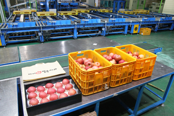 普通だったらこんなところ見学できませんが、栄州市の方と、センター長さんの計らいで特別に入れていただきました。ちょうど日曜日で作業自体はお休みでしたが、施設内に入った瞬間からリンゴの甘い香りに全身が包まれて思わず陶然。