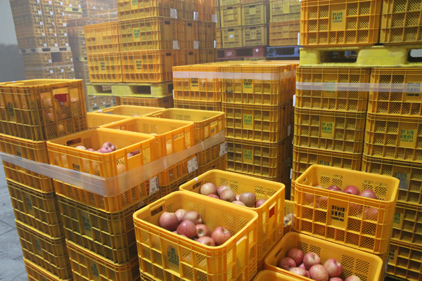 低温貯蔵室には出荷前のリンゴがずらり並んでいました。