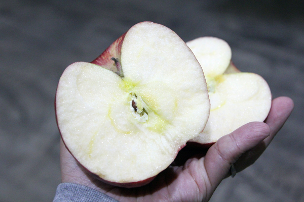 とセンター長さんがリンゴを手に取り、ふんっ! と力を入れたかと思うと見事に真っぷたつ。そのパワーにも驚きましたが、かぶりつくなりバシュッと水気が弾け飛んでその瑞々しさにもびっくりでした。そして甘い。