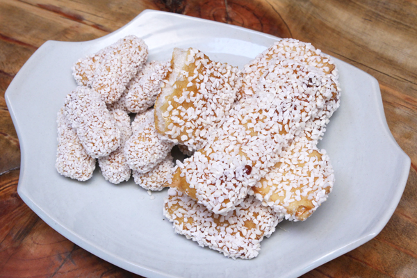 油菓(ユグァ、유과)という伝統菓子の中ではポピュラーな揚げ菓子で、注目すべきは表面に貼り付けられている炒り米の下。ほんのり茶色みを帯びているのがわかるかと思いますが、リンゴを加えた水飴をまとわせています。