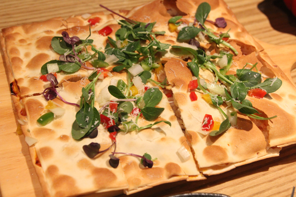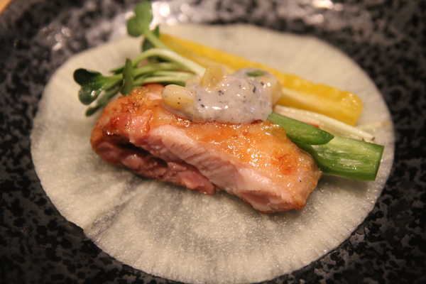 薄切りにした酢漬け大根にローストした鶏肉と、キュウリ、パプリカなどの生野菜を載せ、2種類のソースをかけて味わいます。ビールとともに真夏にぴったりの爽快感。