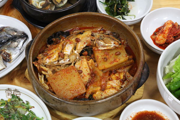 個人的なイチオシはこちらのケクチュリジョリム(カワハギ、またはウマヅラハギの煮付け、객주리조림)。大豆を一緒に煮込むのが済州島式です。
