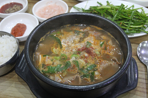 あるいはちょっとヒネって同じ南部市場内でも、もうひとつの名物であるスンデクッパプ(腸詰めのスープごはん、순대국밥)という選択肢もあります。市場内で向かい合う「チョジョムネ南門ピスンデ(조점례남문피순대)」と「豊南ピスンデ(풍남피순대)」が有名。
