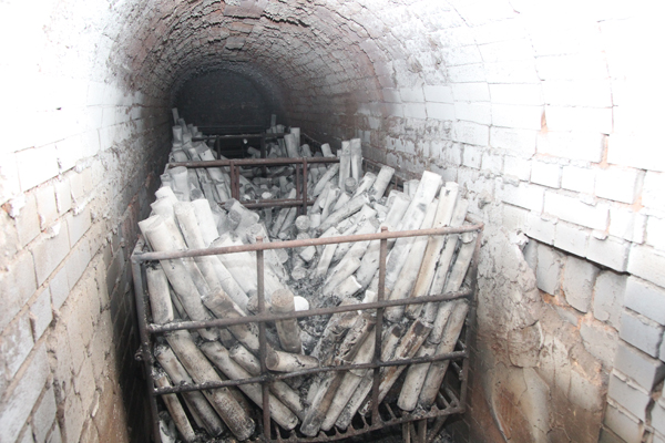 大きな窯の中で筒状に固まっているのは、竹筒に入ったまま高温で熱せられた塩。竹だけが燃え尽きてこうなるという状態ですが、火にかける過程で竹のエキスが塩に染み込むということになります。