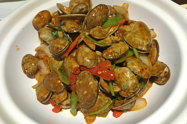 ピリ辛に味付けられたパジラッポックム(アサリの炒め物、바지락볶음)。