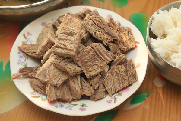 写真にはありませんが、一緒に添えられた薬味醤油につけて食べます。煮込んだ肉のかたまりを食べやすく切っただけというシンプルな料理ですが、薬味醤油につけることでチャンジョリム(牛肉の醤油煮、장조림)風の味わいになります。