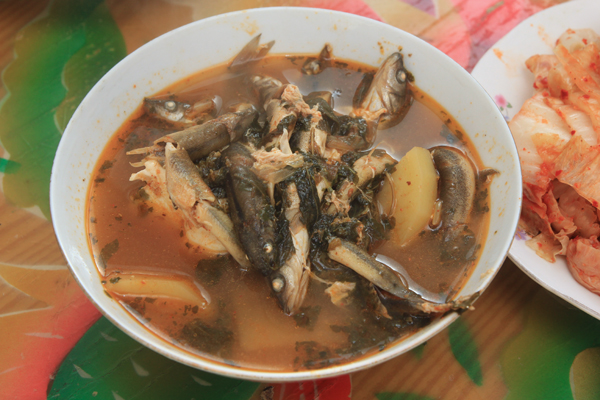 ポドゥルゲ(アブラハヤ、버들개)という川魚を煮込んだもので、いわゆるミンムルコギメウンタン(川魚の辛い鍋、민물고기매운탕)の一種ですが、単一の魚なのでポドゥルゲメウンタン(アブラハヤの辛い鍋、버들개매운탕)と呼んでもいいでしょうね。とりあえずポドゥルゲと聞いて、「韓国語食の大辞典」を調べたらしっかり出てきたのは現地でガッツポーズでした。