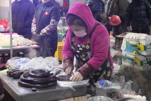 スンデ(韓国式の腸詰/순대)を切っているお母さんがいて……。