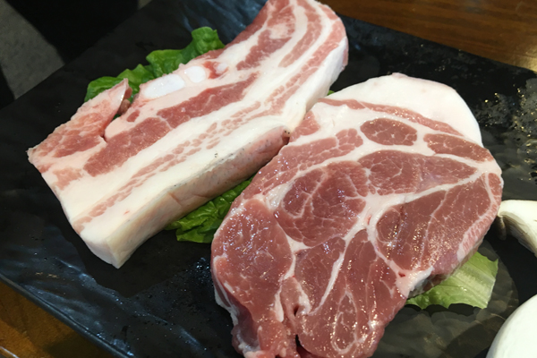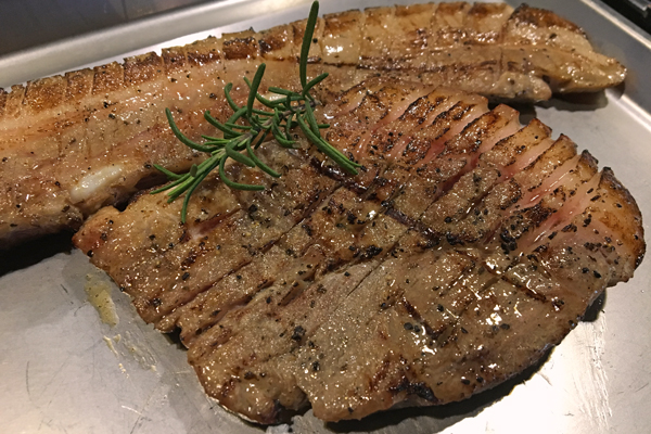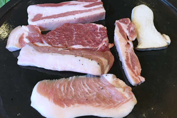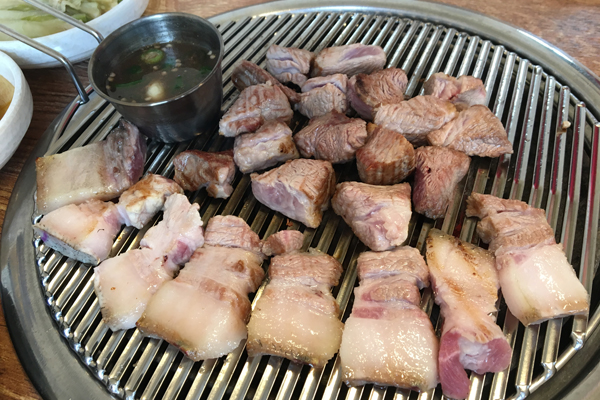 クンゴギとは1斤=600gの肉を指し、済州島にある多くの店ではオギョプサルとモクサルをセットにして提供します。新済州郊外にある「トンサドン(돈사돈)」という店がたいへん有名ですが、この提供形式を採用する店が以前よりも格段に増えていました。