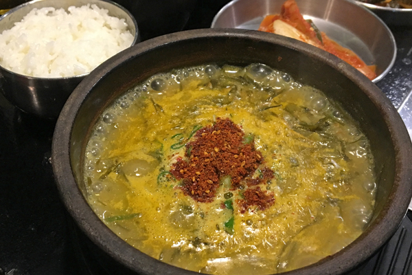 焼肉店における食事メニューといえば済州島に限らず、ネンミョン(冷麺/냉면)とテンジャンチゲ(味噌鍋/된장찌개)が双璧です。済州島においてもそれは変わらなかったのですが、今回訪れた店のひとつに……。