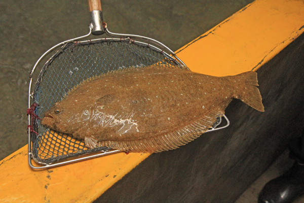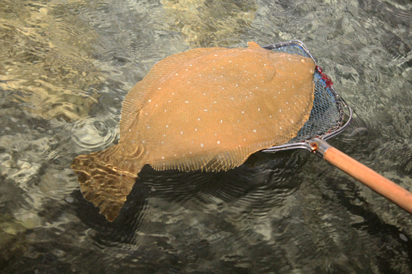 いえ、ビチビチ跳ねているのは写真用にすくい上げてもらったからですね。実際は養魚場の底面でおとなしくしていますが、ちょっとでも人の気配を感じると、シュババババッとすごい勢いで動きまわります。なんとなく砂の中でじっとしている印象のあるヒラメですが、予想以上に動きが俊敏であることを初めて知りました。