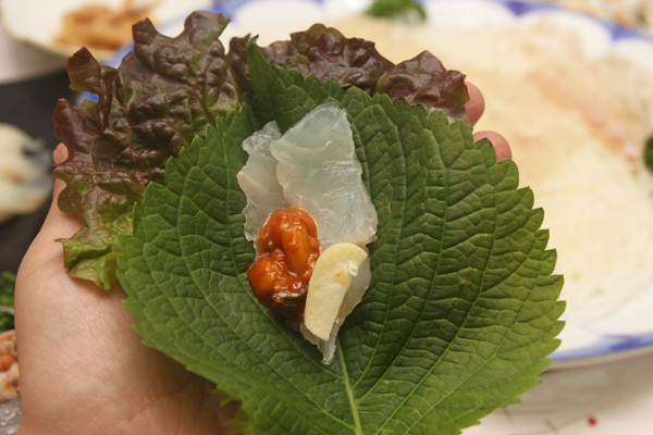ワサビ醤油のほか、チョコチュジャン(唐辛子酢味噌、초고추장)につけるか、サンチュ、エゴマの葉などの葉野菜に包んで食べるのが韓国式。