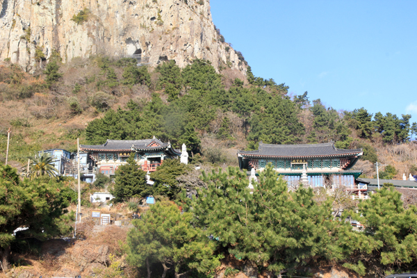 火山活動によってできた溶岩ドームのひとつで、奇岩怪石の多い済州島ではありますが、ここもまた何度となく眺めたくなるこんもり具合です。写真右下にお寺があるのにもご注目。頑張って石段を上ると石窟に仏様も鎮座しています。