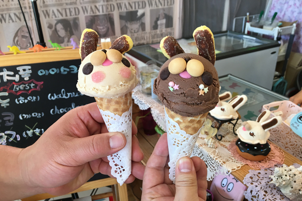 今回もふもとまで行って写真を撮って、話題のこのアイスクリームを目指してしまいましたしね。「チチポン(치치퐁)」というお店で作ってくれる、ウサギ風のかわいらしいアイスクリームです。左の白いほうがクルミ味で、右がチョコ味です。