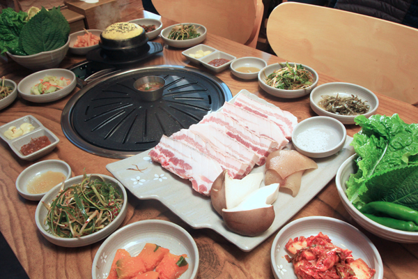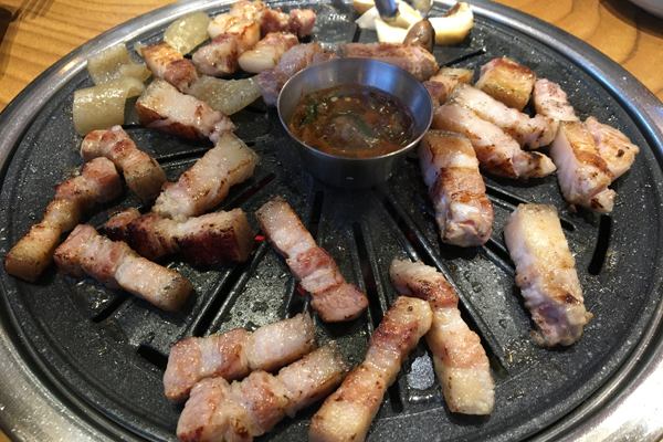 黒豚のオギョプサル(皮付き豚バラ肉の焼肉/오겹살)をはじめ、黒豚のモクサル(豚の肩ロース焼き/목살)、ヤンニョムカルビ(味付けの豚カルビ焼き、양념갈비)といった豚焼肉メニューを用意しています。新大久保で人気だった、マクチャングイ(豚の直腸焼き、막창구이)もあるようですね。