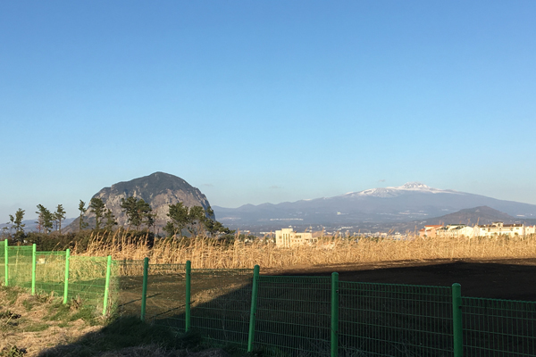 左手前に山房山、右奥に韓国最高峰の漢拏山(1950m)。なかなか写真では伝わりにくいのですが、山房山は平野部あってにここだけこんもり高いので、その唐突な感じがなんとも不思議な景観となっています。