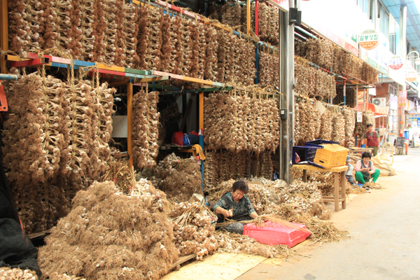 慶尚北道では義城のニンニク市場を見ましたが、こちら丹陽もニンニクの名産地。市外バスターミナル近くの九景市場には、6月中旬の収穫を終えたばかりのニンニクがずらり。7~8月まではこの光景が見られます。市場内はニンニクを使ったグルメも充実。ニンニクチキン、ニンニクスンデなどが美味でした。