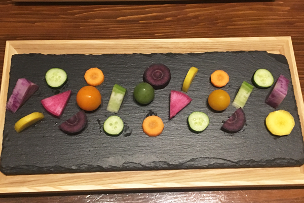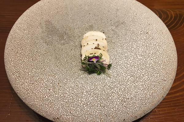 大皿は持って驚くぐらいにしっかり冷やされており、そのあたりにもシェフの気遣いが感じられます。中央にちょこんと配されているのは……。