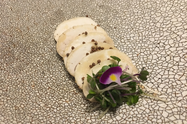 花をあしらった生のマッシュルームでした。最近の韓国における流行りといってもよいかと思いますが、鮮度のよいキノコを生で食べることが増えています。ほんのりと塩味がつけられていて、エゴマの実がぷちぷちとした食感のアクセントになります。