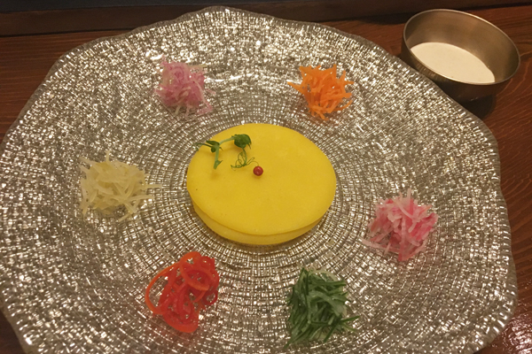 宮中料理のクジョルパン(宮中式クレープ包み/구절판)が8種類の具材を用いるのに対し、6種類で作るものをチルチョルパン(칠절판)と呼びます。中央のミルチョンビョン(小麦粉の薄焼き、밀전병)はクチナシで色をつけているとのこと。添えられているピンクペッパーとエンドウマメの幼葉にも美学が感じられます。