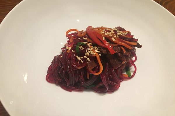 朴洙炯シェフといえばこの料理、という印象が強いですね。真っ赤な色合いが目を引きますが、ビーツの風味もしっかり効いています。というか、直前のチルチョルパンに2種類のビーツが入っていたので、その風味が余韻として残ったまま、チャプチェ(春雨炒め/잡채)でもう1度花開くといった感じでした。