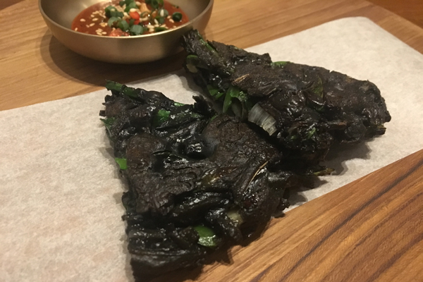 赤いチャプチェのあとに、真っ黒なチヂミというダイナミックな振り幅に驚かされます。この黒さはイカスミを使ったもので、もっちりとした食感の中からはぷりぷりのイカも登場。ヤンニョムジャン(薬味ダレ)につけていただきます。