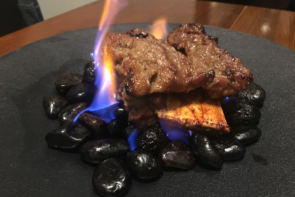 巨大な状態で出てきた牛カルビを切り分け、さらにアルコールをかけた石の上に載せて火をつける、という一連のパフォーマンスが鮮やかです。もう大騒ぎで写真を撮るしかないという感じ。さすが魅せ方をよくご存じです。
