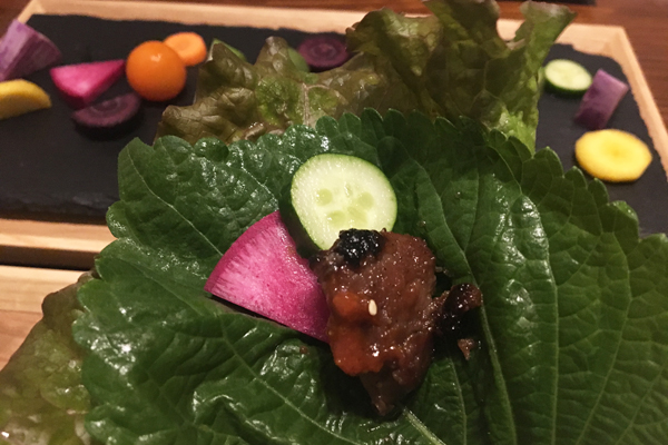 サムとは本来包むという意味で、肉料理と一緒に提供するサンチュ、エゴマの葉といった野菜を指すことが多いですが、ここではひと口大の野菜がたっぷり出てきました。これとセットになっているのが……。