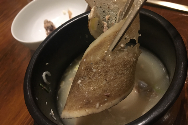 鹿の角を薄く切ったもの。鹿角(ノッカク、녹각)と呼ばれ、かなり高価な韓方材のひとつです。これ自体はかなりケモノ臭が強いので、ひとしきり眺めたら骨入れの器に遠ざけるぐらいでよいと思いますが、ここまで立派なサイズのものは初めて見ました。あえて韓方材の名前を店名につけた「HASUO」の本気を見た思いです。