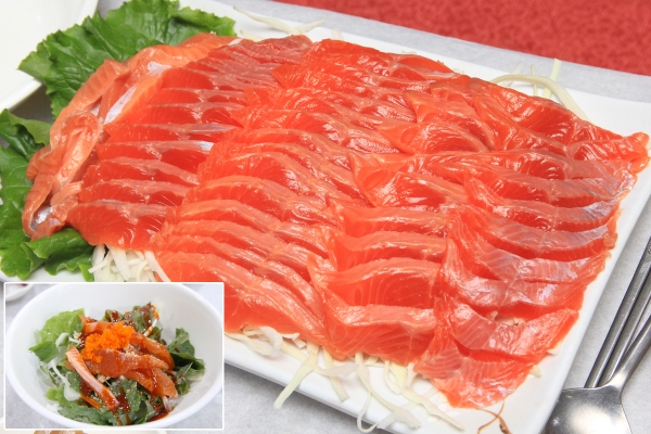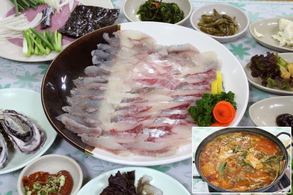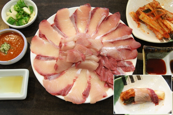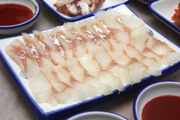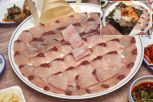 【韓国の旬メシ062】左の1列がサムシギフェ(カジカの刺身、삼식이회)、右の2列はスンオフェ(ボラの刺身、숭어회)。金浦市郊外の大明港における冬の名物です。刺身を食べた後は、メウンタン(アラ鍋)に。