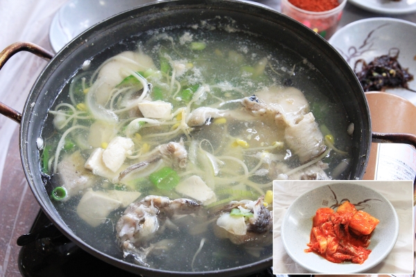 【韓国の旬メシ059】スケトウダラを澄まし仕立ての鍋にした、ミョンテチリクッ(명태지리국)。江原道のいちばん北に位置する高城の名物で、真冬の寒い時期がシーズンです。右下はスケトウダラのエラを加えた大根キムチ。